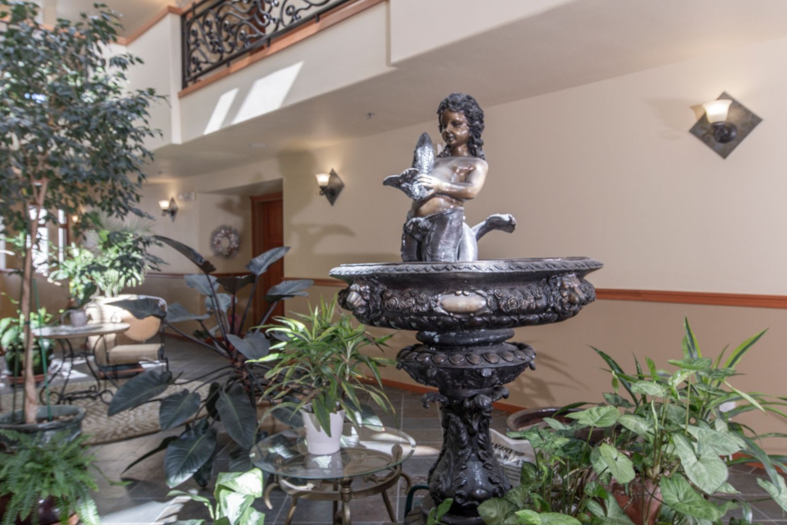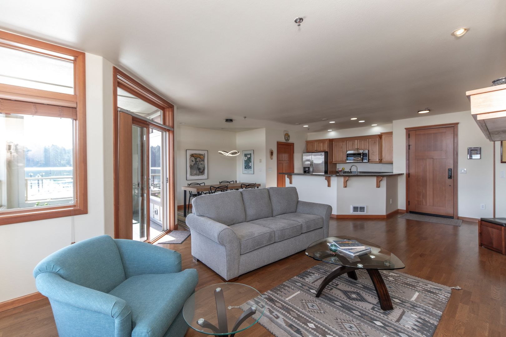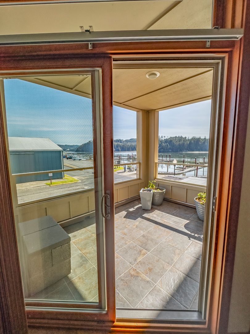 Elegant riverfront condo in Oldtown Florence - Stunning views of the river and marina. Thoughtfully designed with high-end finishes, this furnished unit features tile flooring, granite countertops, and stainless steel appliances, and comfortable, usable space. The open-concept living area boasts a cozy gas fireplace, while the south/east-facing covered balcony provides the perfect space to relax and take in the scenery. The gourmet kitchen includes a pantry, breakfast bar, and beautiful cabinetry. Retreat to the spacious primary suite, complete with a jetted tub and a walk-in closet. Additional amenities include a beautiful central atrium with natural lighting, secure parking, and an elevator for easy access.
